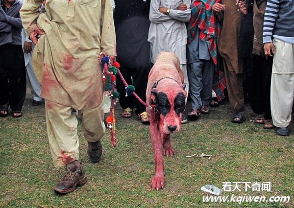 巴基斯坦Khyber-Paktunkhwa省,当地年度斗狗比赛上,一只落败的犬被咬的鲜血淋淋。